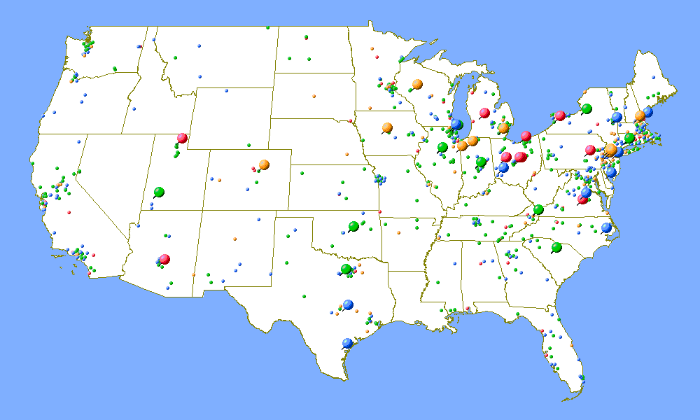 The following maps were generated from the ARRL's online contest database of results for the 2002 ARRL 160 Meter Contest. Callsigns are matched up to ZIP codes using the FCC database, which are then matched up to latitude and longitude (which means that two stations in the same ZIP code will be given the exact same latitude and longitude values.) The mapping software I used only does maps the United States of America, so these maps are limited to only U.S. contestants. Furthermore, these maps only represent U.S. contestants that submitted a log to the ARRL after the contest. There are certainly many more stations across the country who operate the contest, but do not send in their logs.