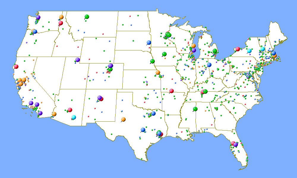 The following maps were generated from the ARRL's online contest database of results for the 2003 ARRL November Sweepstakes, CW. Callsigns are matched up to ZIP codes using the FCC database, which are then matched up to latitude and longitude (which means that two stations in the same ZIP code will be given the exact same latitude and longitude values.) The mapping software I used only does maps the United States of America, so these maps are limited to only U.S. contestants. Furthermore, these maps only represent U.S. contestants that submitted a log to the ARRL after the contest. There are certainly many more stations across the country who operate the contest, but do not send in their logs.