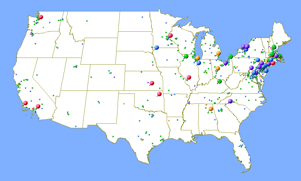 The following maps were generated from the ARRL's online contest database of results for the 2003 ARRL January VHF Sweepstakes. Callsigns are matched up to ZIP codes using the FCC database, which are then matched up to latitude and longitude (which means that two stations in the same ZIP code will be given the exact same latitude and longitude values.) The mapping software I used only does maps the United States of America, so these maps are limited to only U.S. contestants. Furthermore, these maps only represent U.S. contestants that submitted a log to the ARRL after the contest and who were not operating in the Rover category. (Entrants in the single operator, portable categry are mapped using their callbook ZIP codes, even though they might have operated from another location.) There are certainly many more stations across the country who operate the contest, but do not send in their logs.