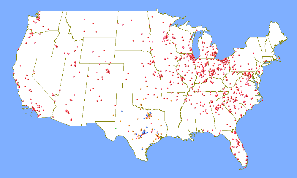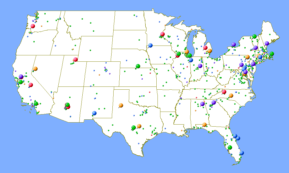 The following maps were generated from the ARRL's online contest database of results for the 2003 ARRL June VHF QSO Party. Callsigns are matched up to ZIP codes using the FCC database, which are then matched up to latitude and longitude (which means that two stations in the same ZIP code will be given the exact same latitude and longitude values.) The mapping software I used only does maps the United States of America, so these maps are limited to only U.S. contestants. Furthermore, these maps only represent U.S. contestants that submitted a log to the ARRL after the contest and who were not operating in the Rover category. (Entrants in the single operator, portable categry are mapped using their callbook ZIP codes, even though they might have operated from another location.) There are certainly many more stations across the country who operate the contest, but do not send in their logs.