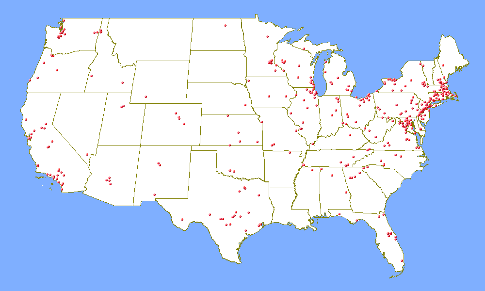 The following maps were generated from the ARRL's online contest database of results for the 2003 ARRL September VHF QSO Party. Callsigns are matched up to ZIP codes using the FCC database, which are then matched up to latitude and longitude (which means that two stations in the same ZIP code will be given the exact same latitude and longitude values.) The mapping software I used only does maps the United States of America, so these maps are limited to only U.S. contestants. Furthermore, these maps only represent U.S. contestants that submitted a log to the ARRL after the contest and who were not operating in the Rover category. (Entrants in the single operator, portable categry are mapped using their callbook ZIP codes, even though they might have operated from another location.) There are certainly many more stations across the country who operate the contest, but do not send in their logs.