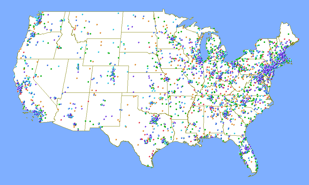 The following maps were generated from the ARRL's online contest database of results for the 2004 ARRL International DX Contest, Phone. Callsigns are matched up to ZIP codes using the FCC database, which are then matched up to latitude and longitude (which means that two stations in the same ZIP code will be given the exact same latitude and longitude values.) The mapping software I used only does maps the United States of America, so these maps are limited to only U.S. contestants. Furthermore, these maps only represent U.S. contestants that submitted a log to the ARRL after the contest. There are certainly many more stations across the country who operate the contest, but do not send in their logs.