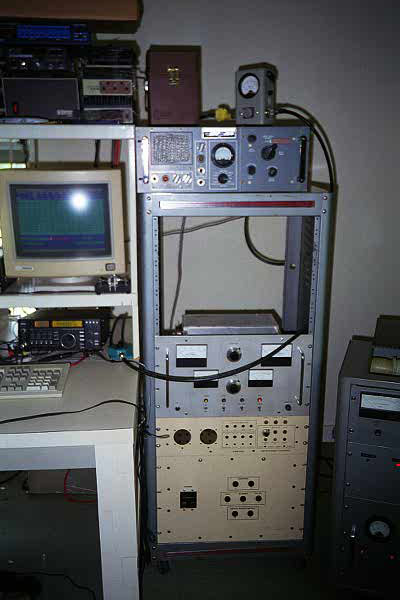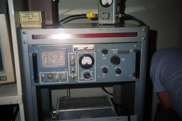 This is an AM-6155 amplifier retired from FAA service in ground-to-air AM transmissions. It has an 8930 tube. It was converted to use on 222MHz SSB/CW by George K5TR. It put out roughly 350 watts this weekend. It wasn't actually in the rack until Sunday afternoon, when a thunderstorm forced us off the air and gave us a few moments to move and adjust things. On top of the rack is a Bird 43 Thruline wattmeter.