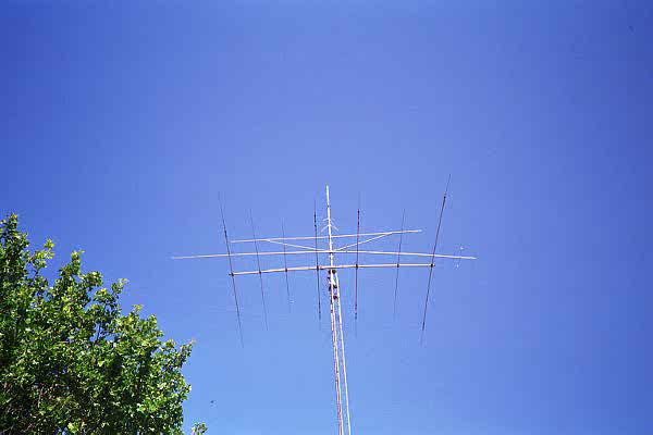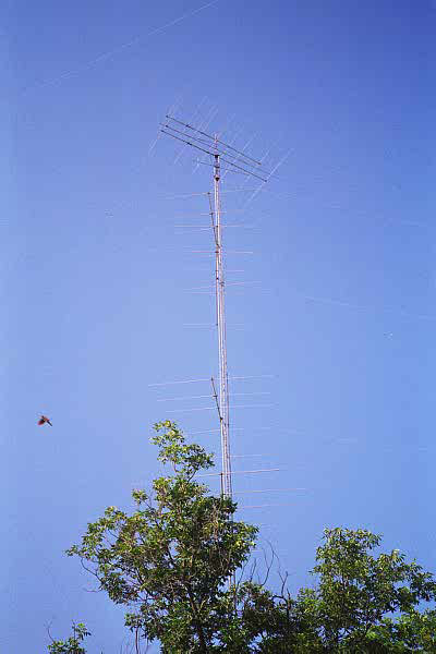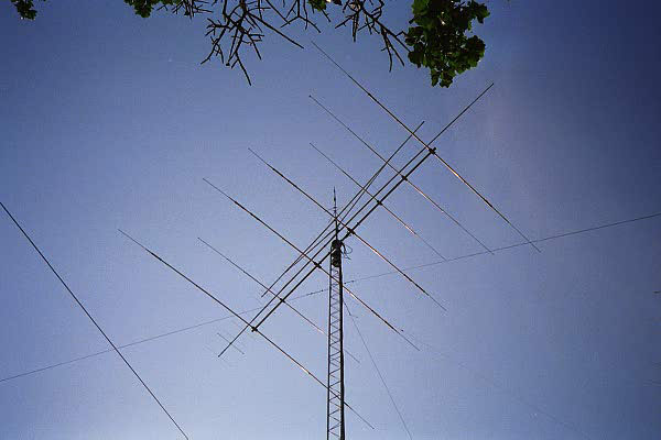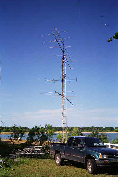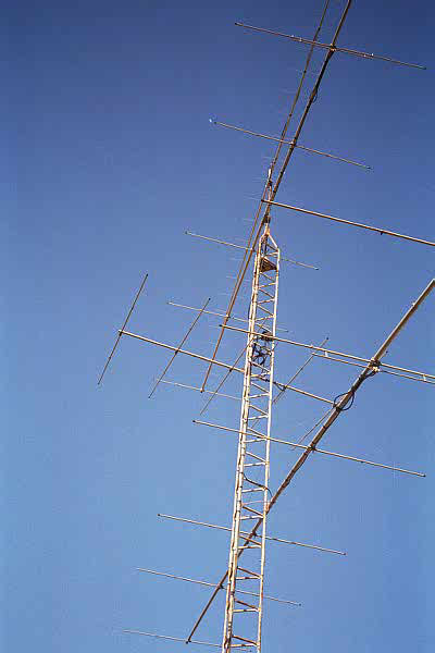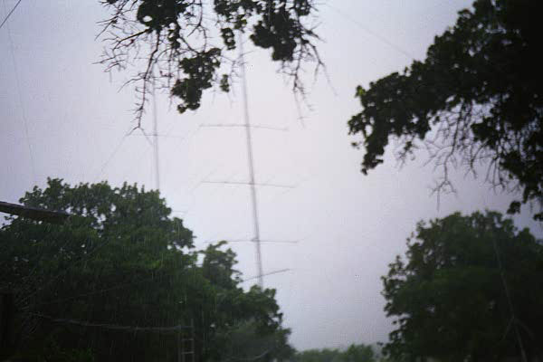 Another view of this tower, from closer to the base. Here, the top and bottom six meter antennas are probably being used as a pair beaming to the northeast. This was our only antenna on 222MHz.