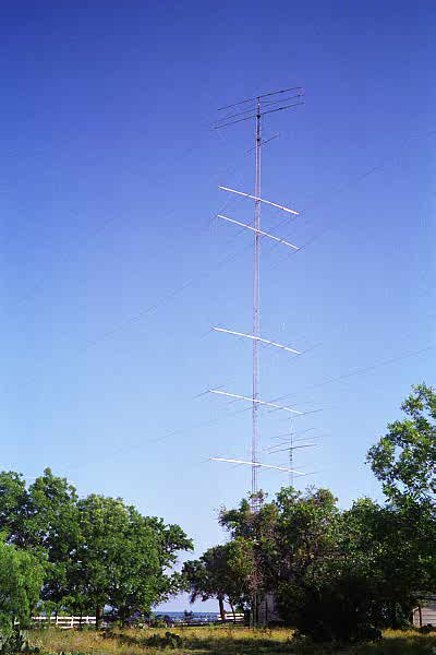This is the second shortest tower at the ranch. From bottom up, a HyGain TH77DX HF tribander antenna (which we did not use that weekend,) an M² 2M18XXX 18-element 144MHz yagi at 60', and a 31-element 432MHz yagi at 65', all on a single rotor. The 144MHz yagi on this tower was the "low" antenna on two meters.