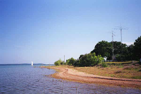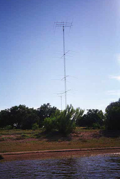 The W5KFT Ranch Station is located on the western shore of Lake Buchanan, a reservoir of the Colorado River. Lake Buchanan is a level-controlled reservoir, so the ranch buildings can be built reasonably close to the water. In this photo, you can see the shorter tower with the six meter stack and 222MHz yagi, and the taller tower directly next to the station, with the 432MHz yagi, one of the 144MHz yagis, and an HF tribander.