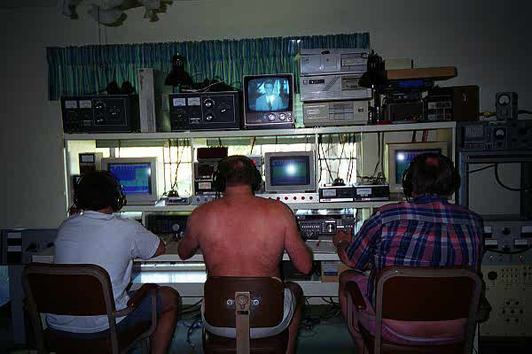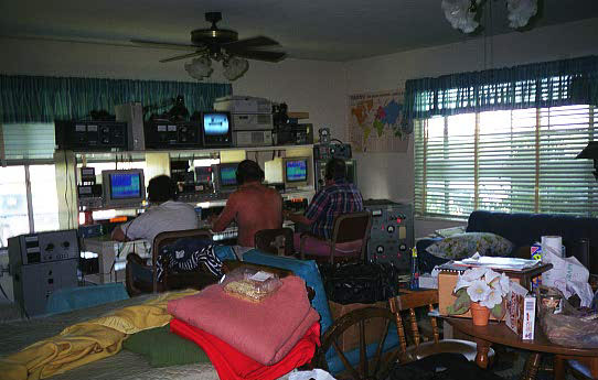 From left to right: George K5TR on 50MHz, Gator N5RZ on 222/432MHz, and Bryan W5KFT on 144MHz. Notice the television on the top shelf - it was used mainly for checking the weather patterns and semi-frequent storm warnings on Sunday.