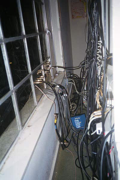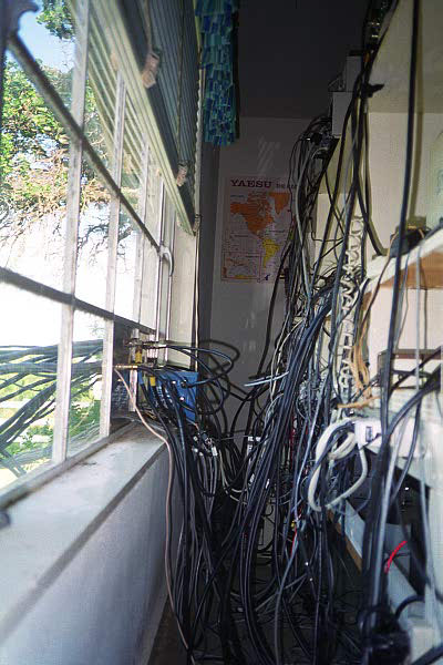 A view behind the operating table at all of the cabling involved in this station. As this station is used for a contest almost every other weekend, be it on VHF or HF, CW, SSB, or RTTY, much of this cabling must be re-wired for each weekend.
