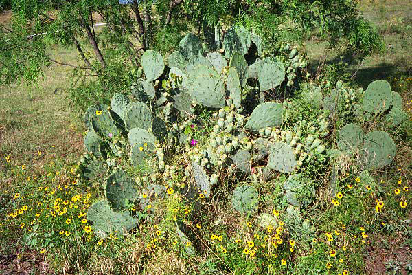 A small clump of cactus. This is the prickly-pear variety, and is quite common in the Texas Hill Country. There are a few small yellow wildflowers around it, but the cactus itself is no longer blooming.