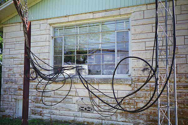 Outside the station, this is the feedpoint entrance. All of the feedlines to the towers are elevated about eight to ten feet off the ground. This was done to make it easy to reconfigure things, and keep the feedlines high enough that the cattle don't chew on them. The tower next to the station supported the 432MHz yagi, and one of the 144MHz yagis.