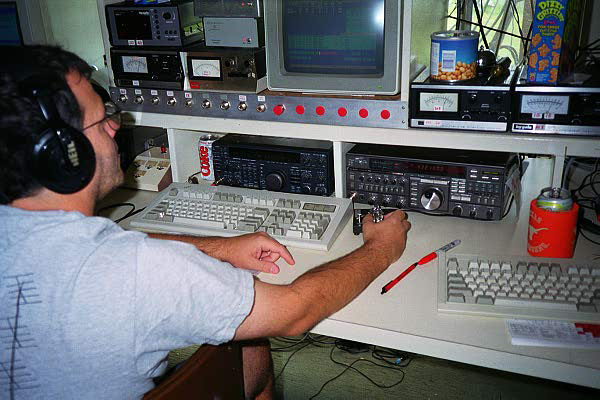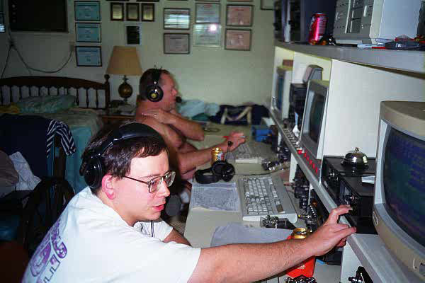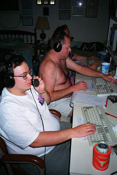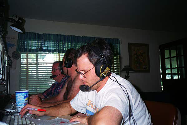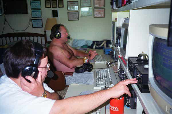Ken KM5FA and Gator N5RZ, after a few hours into the contest. Gator is in the background, on 50MHz, and Ken is in the foregound on 144MHz, apparently adjusting a rotor.