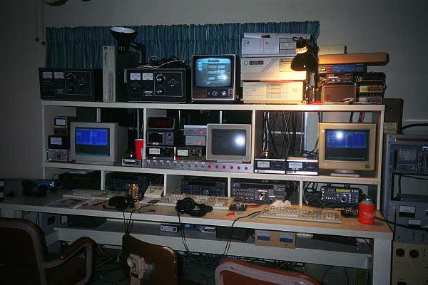 This is the operating table, photographed after the end of the contest. Just to the left of the table is the Henry 2006 amplifier for 50MHz. On the top shelf, left to right: Ameritron HF amplifier, 50MHz logging PC, Ameritron HF amplifier, television for local weather reports, the 222/432MHz logging PC, the 144MHz logging PC, and a spare, various brick amplifiers we didn't use and a converted FM commercial radio used for packet in HF contests. On the next shelf, from left to right: 50MHz wattmeter, unused rotor controller, HF bandpass filter, 50MHz logging monitor, 50MHz coax switch, clock, 50MHz high antenna rotor, unused rotor controller, DEMI 222-28 transverter, DEMI TIB, 50/222MHz rotor controller, 222/432MHz logging monitor, unused HF antenna patch panel, 144/432MHz rotor controller, high 144MHz rotor controller, 144MHz logging monitor. On the table, left to right: Icom IC-736 (50MHz), Kenwood TS-850 (unused), Kenwood TS-850 (222MHz), Yaesu FT-736R (432MHz), and Icom IC-275 (144MHz), plus three keyboards, two Heil Prosets, a pair of AKG headphones with a Heil mic boom and element, and three pair of Bencher iambic paddles. Below the table were DC power supplies, and to the right of the table was the homebrew 144MHz amplifier and the converted AM-6155 222MHz amplifier.