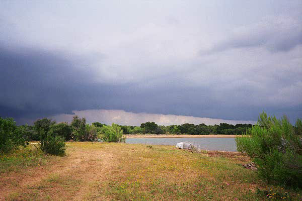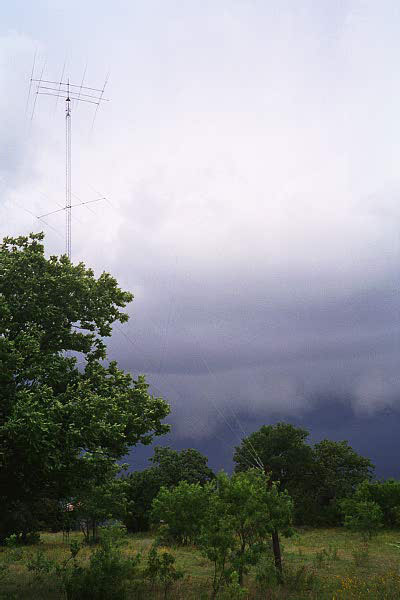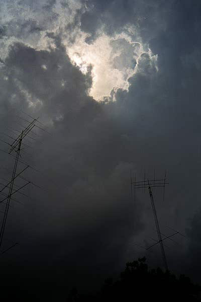 Ominous clouds rolling in from the north toward the high six meter antenna tower.