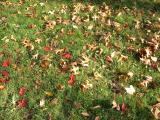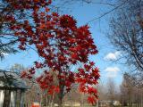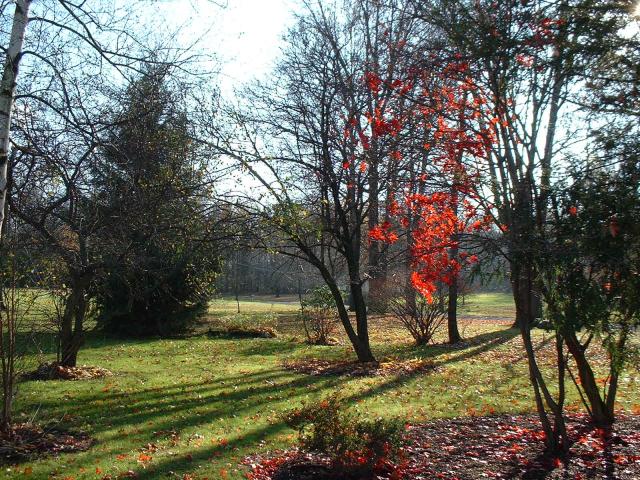 By the end of October, most of the trees had lost their leaves. This one with the red leaves still had about half of its foliage. |