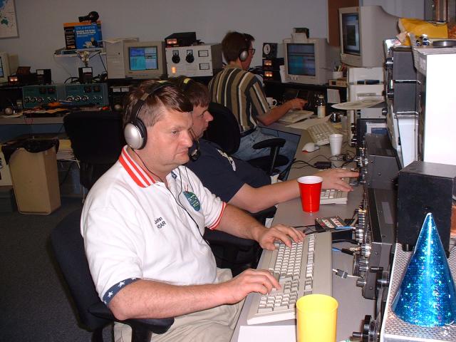 John Dorr K1AR on the 20 meter run station, with John Golomb N2NC on the 20 meter multiplier radio. Both are WRTC veterans. Behind them, Phil Koch K3UA (another WRTC veteran) is on 10 meters. Bob Naumann N5NJ and Tim Duffy K3LR are also WRTC veterans. I was operating in great company! |