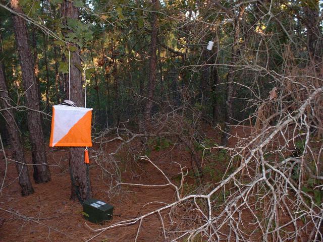 Transmitter MOS was located on top of a hill, north of the start. The transmitters were in surplus 30 caliber ammunition cases. Each case included a 7Ah gel cell battery, power cabling with an ATC blade-type fuse inline, a Realistic HTX-202 HT set to low power transmit (one watt output,) and a Byonics PicCon transmit controller. The box is locked with a padlock and was chained to a tree. The antennas were WB6DRV crossed-dipole turnstile designs using aluminum arrow shafts trimmed to length for the radiating elements. Each site had the standard orienteering control flag and a paper punch. The transmitter case and the control flag both have labels with the transmitter ID. |