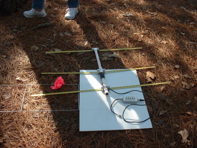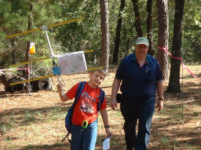 Ten year old Michael Bayern W2CVZ was the youngest competitor in the event. Michael built the tape measure yagi he used on course, and borrowed a VK3YNG receiver from Bob Frey WA6EZV, which was attached to the yagi with cable ties. His father, Mark Bayern AD5SS, followed him on course out in the woods. |