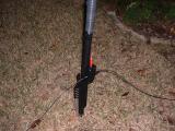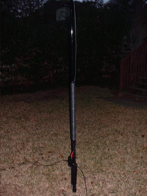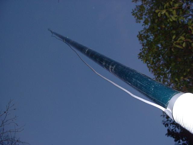 Looking up the telescoping fiberglass pole. The 12 guage stranded wire is periodically attached to the pole with electrical tape.