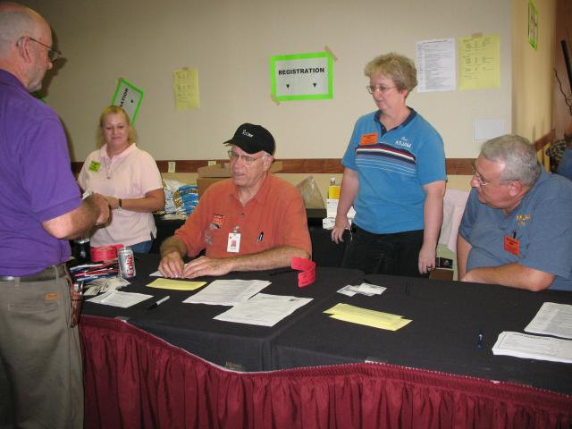 Volunteers at check-in. THe man in the red shirt is Joe Fisher III K5EJL. |