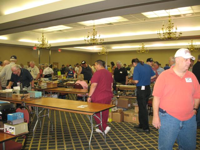 At the swapfest. Maybe a fifth of the tables were empty. I always find it amusing that people are buying and selling the grungiest of ancient radio gear in a room full of chandeliers. |