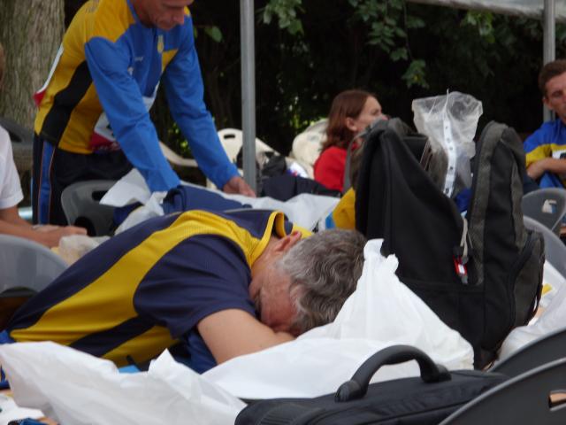 With so many competitors, and starts occurring at five minute intervals, the start times were spread over a three hour window of time. This Ukrainian competitor rests up waiting for his start. |