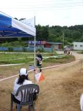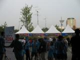 Competitors file into the impound area as two Korean volunteers set up one of the competition banners. |