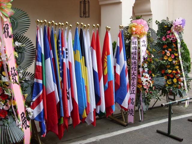 The floral arrangements and all the national flags. |
