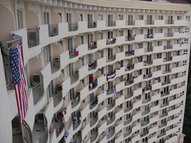 Another view of the hotel itself from our balcony. During the week we were there, a wide variety of international flags and orienteering clothing (set out to dry) would hang from the balcony railings. The American flag belonged to one of our teammates in the room next door. |