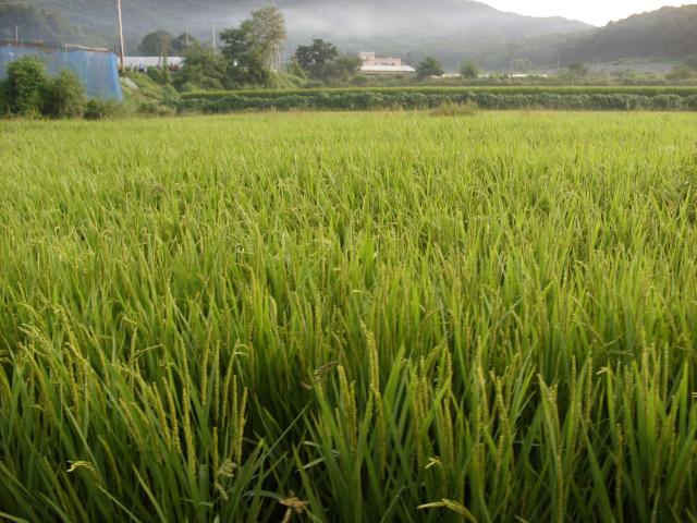 A rice paddy. Rice was growing at various stages of development, from recently transplanted to ready to harvest, throughout the area. |