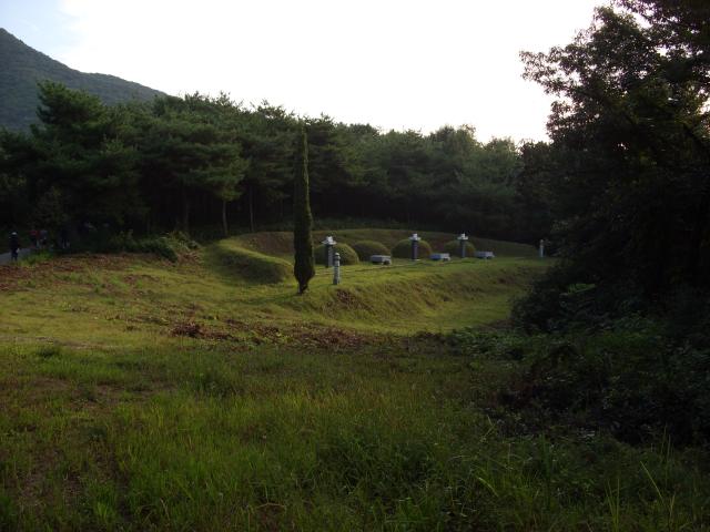 A gravesite. Graves were scattered throughout the competition areas both days. This was the weekend before the Chuseok holiday, which involves visits to gravesites of family ancestors, so the grass and weeds around the graves have been trimmed back. We did not see any modern graveyards in Korea; the majority today apparently opt for cremation. |