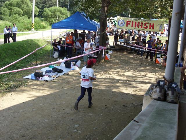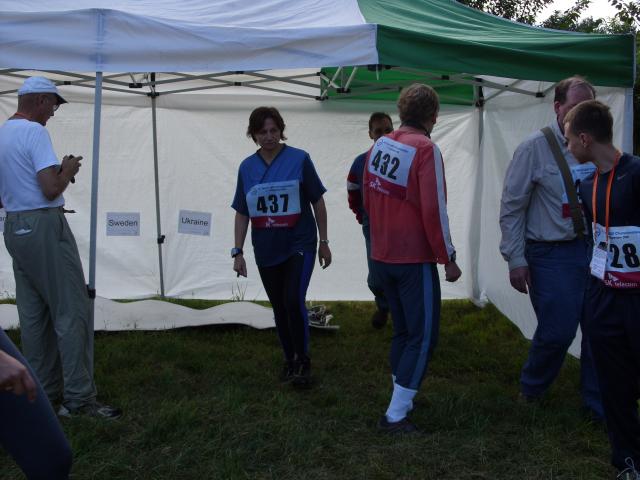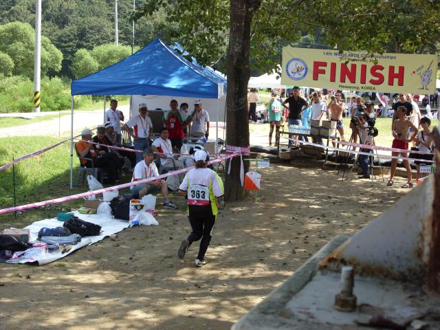 Wang Shuyan (W35) from China runs into the finish line. Wang came in 19th place in this competition, but won a silver medal in the 144 MHz competition two days before - the only medal won by the Chinese at this championships. |