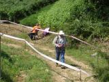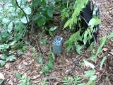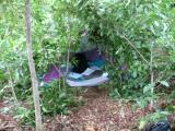 The transmitter and antenna at MOH. The transmitter is the same MyKit FTX-280A transmitter that we used two days before. For an 80 meter antenna, it uses a single vertical wire, that Yoo was able to hang up about six and a half meters in a tree, and a single counterpoise to a ground rod. The transmitter has a matching network in it and a tune indicator to match the random length wires. On 80 meters, the transmitter is A1A (keyed CW). The transmitter in this photo is completely hidden under a bunch of bright green leaves. |