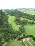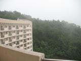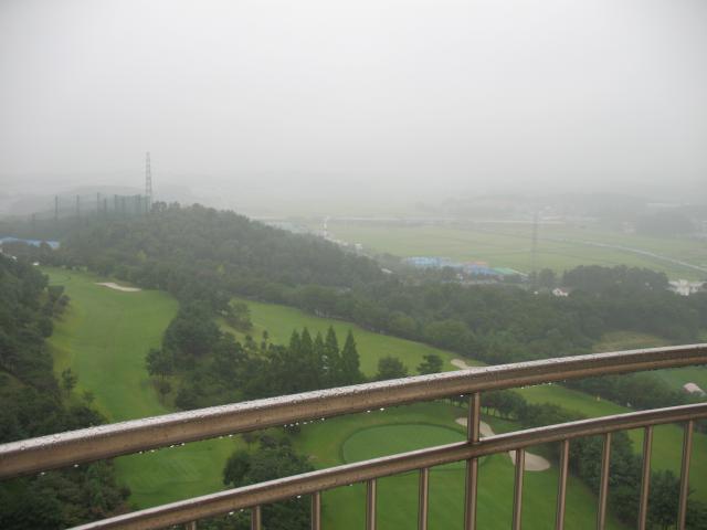 In the rain and fog, you couldn't even see across the little valley we were in. You could only see one hole of the golf course from our room. The green fields on the far side of the road are rice paddies. |