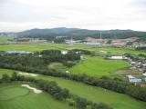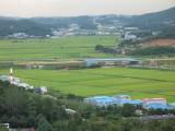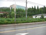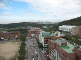 By Tuesday, September 2, the rain had stopped. This is a view from the elevator lobby. In the foreground is the campus of Suwon Science College. It is affiliated with the University of Suwon, and it seemed like all of the students arrived and left via University of Suwon buses or city buses. I think it is a two-year technical school. The dirt field on the left was a soccer field. Every soccer field we saw in Korea was dirt, not grass. In the distance are the high rise apartment buildings of Suwon City. |