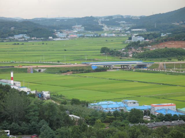 The day we arrived, we went down to the country road for a lunch of kimchi jjige, a spicy stew of pork, cabbage, and chili peppers. There were maybe half a dozen restaurants and as many shops in a ramshackle collection of run-down buildings along the road. This field of peppers was between a FamilyMart franchise convenience store (the nicest store on the street) and a used tire store. The sidewalk was an unusual feature - we did not see many outside of the city center. The building on the hill in the background is part of the Suwon Science College. |