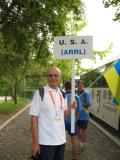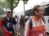 In the coral colored jersey, Jay Hennigan WB6RDV looks for the USA bus. The organizers allocated each bus to one or more countries. I think this helped the organizers make sure that nobody was left behind, as they could rely upon the team captains to report that everyone was present and accounted for. The USA and the Ukraine shared one bus. In the blue jersey is Bruce Paterson VK3TJN, who turned out to be on a different bus that was shared by four countries with smaller teams. |