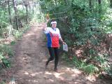 A Chinese runner coming up the trail. She is holding an 80 meter receiver, probably a PJ-80, based on a ferrite rod antenna design. Ferrite rod antenna designs allow for lighter-weight, more-compact receivers, but are not quite as sensitive as magnetic loop receiver designs. |