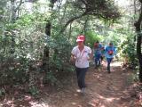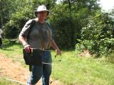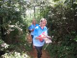 Jen Harker W5JEN, on the trail during the practice. Jen is holding a 144 MHz rig made from a VK3YNG Foxhunt Sniffer Mark IV receiver and a home-made WB2HOL tape measure yagi. |