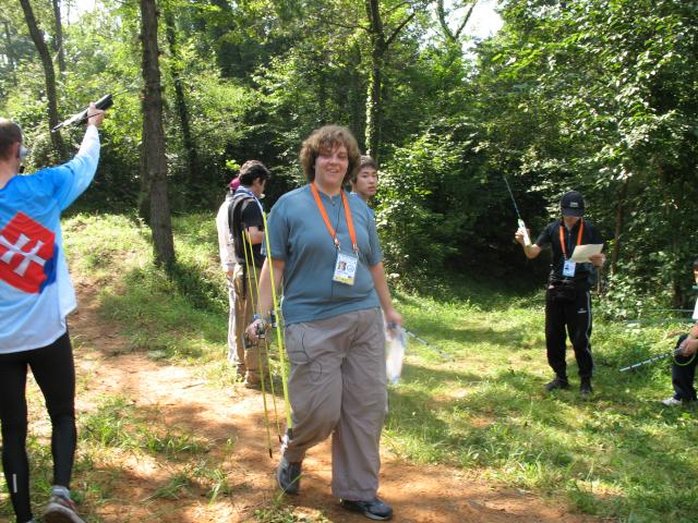 A member of the Czech Republic team, practicing on 144 MHz. Her receiver incorporates only two elements to create a directive pattern. |