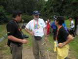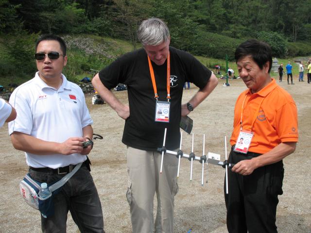 Wang Lijun BD1OO from China (left) was promoting the products of the Beijing TopRadio Science and Technology Company. Here he is showing two of the international jurors, Rainier Floesser DL5NBZ (center) and Chen Ping BA1HAM (right) an ARDF receiver designed for 433 MHz, a radio frequency that is not frequently used for recreational direction finding outside of China. |