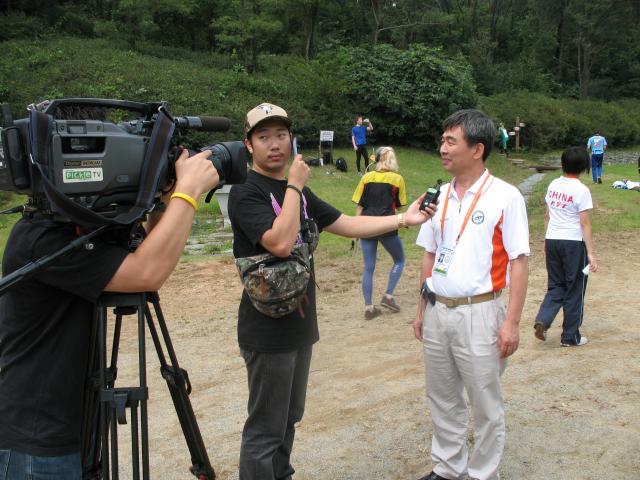 The local media showed up for the practice. In addition to filming at some of the practice transmitters, they interviewed the organizers. Han Jeong Hoon HL2AGG, the President of the Korean Amateur Radio League, is preparing to answer questions for a television news reporter. |