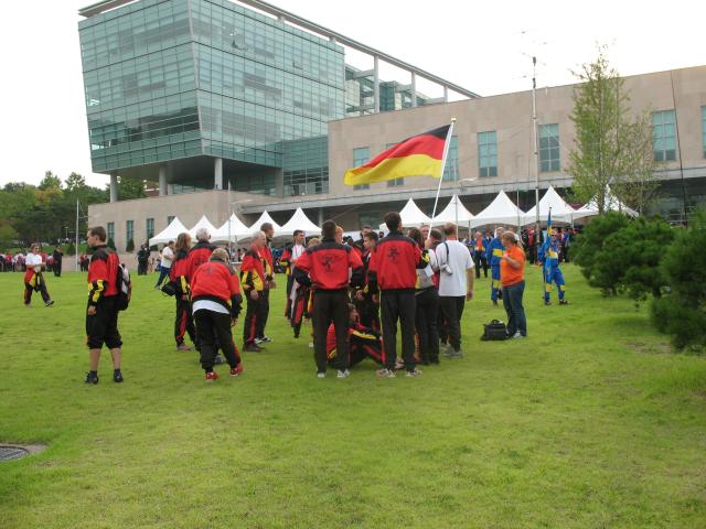 Team Germany gathering on the lawn. The performance hall building had a very modern style to it. |
