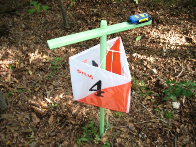 The control flag and electronic punch for the finish beacon on the practice day. The championships used SportIdent electronic timing devices. All of the controls used steel stands just like this. |