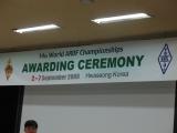The awards ceremonies were held in a lecture hall at the Suwon Science College next door to the La Vie d'Or hotel. These photos are all from the 144 MHz awards. The major difference between the 144 MHz award ceremony and the 3.5 MHz award ceremony was that there were fewer countries represented in the 3.5 MHz medal counts. After the 3.5 MHz competition award ceremony, the organizers hosted a party outside in the patio garden at the hotel.