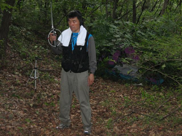 The transmitter operator at my control was Yoo Dong Gul DS4OMS. Yoo was in charge of setting up the transmitter and doing any troubleshooting necessary with the equipment during the competition. We brought my RF-2D 144 MHz receiver to be able to verify that we could hear all the transmitters from our location. Yoo's trousers are wet because we had to walk through some meadows with heavy morning dew to get to our patch of woods. |