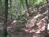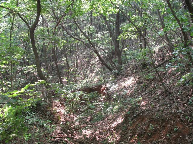 Looking upstream from the transmitter location. The sides of the gully were moderately steep. Maybe half of the competitors to arrive at the control approached it by walking along the top of the ridge on one side or the other and came down the sides of the gully directly to the flag. |