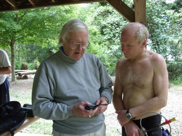 Dale Hunt WB6BYU from Oregon (right) describes the design of his homebrew 80 meter receiver to Masahiko Mimura JH4JQH (left), who came to the championships from Tokyo, Japan. Dale is the IARU Region II ARDF Coordinator..