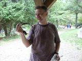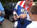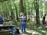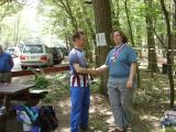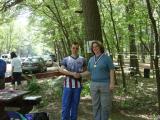 On Sunday afternoon, after all the runners had come in, Vadim Afonkin KB1RLI opened the awards ceremony. Behind him, strung between two trees, are small pieces of paper that record the times for each of the competitors. As soon as a competitor's time is computed, the paper is stapled onto the string in the relative order of finish with the other competitors in the same category. This is a traditional, low-tech way of posting a running "scoreboard" during orienteering meets in North America.