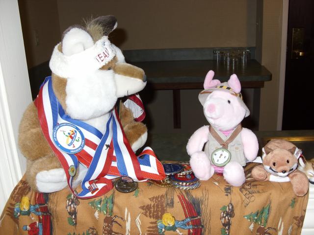 Ardy Fox, the official team mascot of Team USA, together with Hamlet and a new friend. Ardy has a medal from each of the USA ARDF championships.