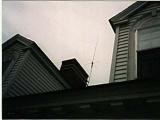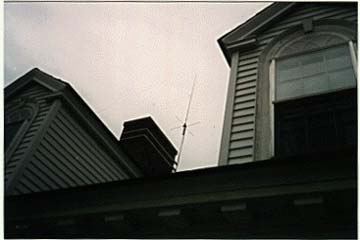 A Hustler G6270R dual-band vertical antenna for 144 MHz and 440 MHz, mounted on the roof of Phi Tau Coeducational Fraternity at Dartmouth College. This was my first antenna system as a Tech+ licensee with the callsign N1PVB. The photo was probably taken in 1994. |